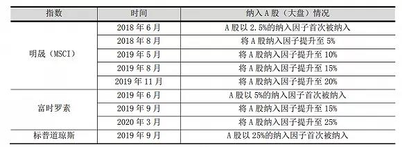 隨著金融業(yè)對外開放的不斷推進,明晟(MSCI)、富時羅素、標普道瓊斯三大國際指數(shù)公司先后將A股納入其全球指數(shù)體系, 并相繼提高納入因子。
